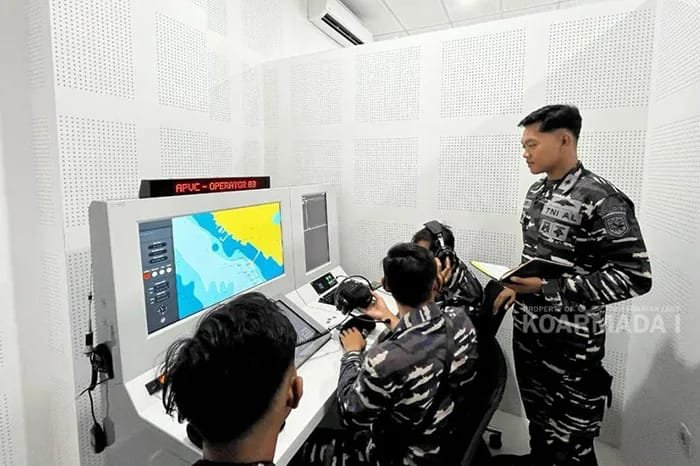 Jakarta – Prajurit TNI AL dari Satkat Koarmada I menggelar latihan simulasi menghadapi ancaman illegal fishing di Laut Natuna Utara, Senin (23/2). Radar mendeteksi kapal asing yang mencurigai melakukan pencurian ikan, sekaligus menghadapi kapal perang asing yang mendekat ke wilayah ZEE Indonesia.